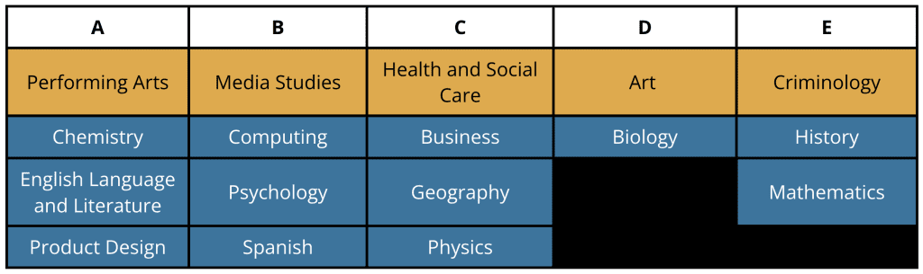 Select three core A-level and/or BTEC subjects, each from a different subject block.